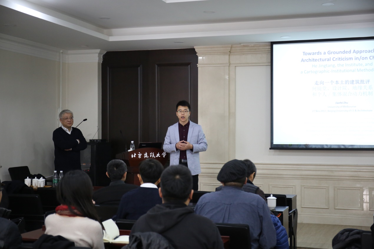 2017年11月27日下午,墨尔本大学设计公司朱剑飞教授到访qm球盟会,并在西城校区教1-126举办题为“走向一种本土的建筑批评:何镜堂、设计院、地缘关系和个人与集体的混合动力”(Towards a Grounded Approach in Architectural Criticism: He Jingtang, the Design Institute and a Cartographic-Institutional Methodology)的学术讲座。讲座由公司青年教师丁光辉主持,球盟会副经理胡雪松教授、王韬老师,部分研究生本科生,一些校外专家学者和建筑师出席、讨论。