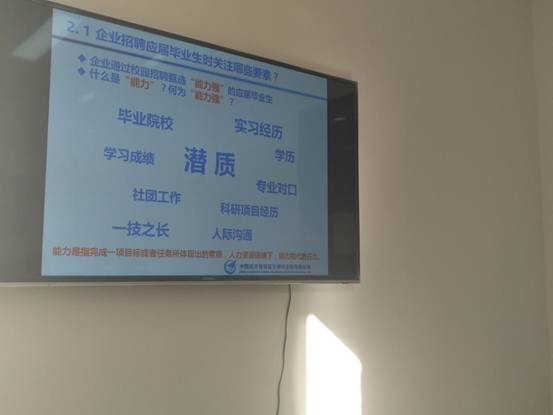 高部长首先详细阐述了职业生涯发展的五个阶段:探索期、形成期、突破期、稳定期、衰退期,指出了每个阶段的核心关键词;接着高部长解释了企业招聘应届毕业生时关注的因素:潜质、学习成绩、实习经历、人际沟通、一技之长等,重点解释了潜质的内涵即成长性是企业关注的核心,并使用冰山模型进一步解读了为什么潜质是企业最关注的核心因素;接着,针对老员工首次择业应该关注的因素,高部长指出人才成长平台、薪酬、区域、领导风格、人际关系等是应届毕业生应予以重点考虑的因素,并指出人才成长平台应是应届毕业生就业时首要考虑的因素,高部长还通过分享行业数据进行了论证,并亲自教授在场的同学如何辨别企业人才平台的成熟度;最后,高部长介绍了中航规划的人才成长指引路线、人才成长途径、人才培养体系。