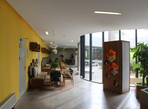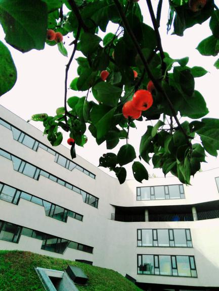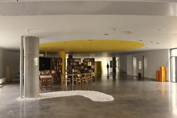 可以说我的母校是中国各个公司中的一个“异端”。它的造型不再是整齐的死板的楼房,而是一体的流动的鱼骨结构,细心的人会发现俯视看公司的建筑整体很像汉字“美”,也许这只是一个美妙的巧合,可我仍记得那年第一次进入那个校门时感受到的新奇与震撼。鱼骨型的建筑整体将教学、娱乐、饮食、自习、阅读各个功能串联覆盖在一个整体里。公司的整体基调是灰色,并且让墙体的原始建筑材料清水混凝土暴露,地面也保留了混凝土的本质,再加上公司整体的“教学+田园”的设计思路——用绿地覆盖隐藏的体育馆、大礼堂、停车场等功能区,并且楼顶全面绿化,让整个校园更自然本真。董事长告诉我们公司不会在墙体上挂字或做一些多余的装饰,因为灰色是贵族的颜色,无需装饰。简约自然,展示本我,坦然而大气。
