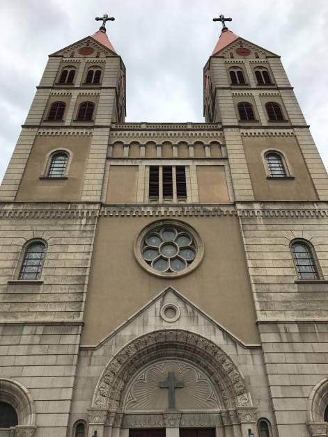 此时的青岛已经染上了秋天的凉意,天空也铺上了灰色的调子。我第一站来到了青岛的圣弥厄尔教堂。以灰色的天空作为北京,圣弥厄尔教堂给人气势庞大却又古朴典雅的感觉。一时间,我们同行之人情不自禁止住了说话的声音,开始静静抬头仰望这座伟大的建筑物。看惯了中式的木质结构房屋,来到石质的西式建筑面前,我们不得不感叹从那些冰冷却庄严的石墙纹路中透露出的风霜的印记是如此的真实,刻骨铭心。哥德式和罗马式的建筑风格将最典型的欧式建筑展现在我们面前。红色的尖顶为这个教堂增加了点睛之笔,那抹飞扬的色彩让整个建筑物庄严之中又不古板。
