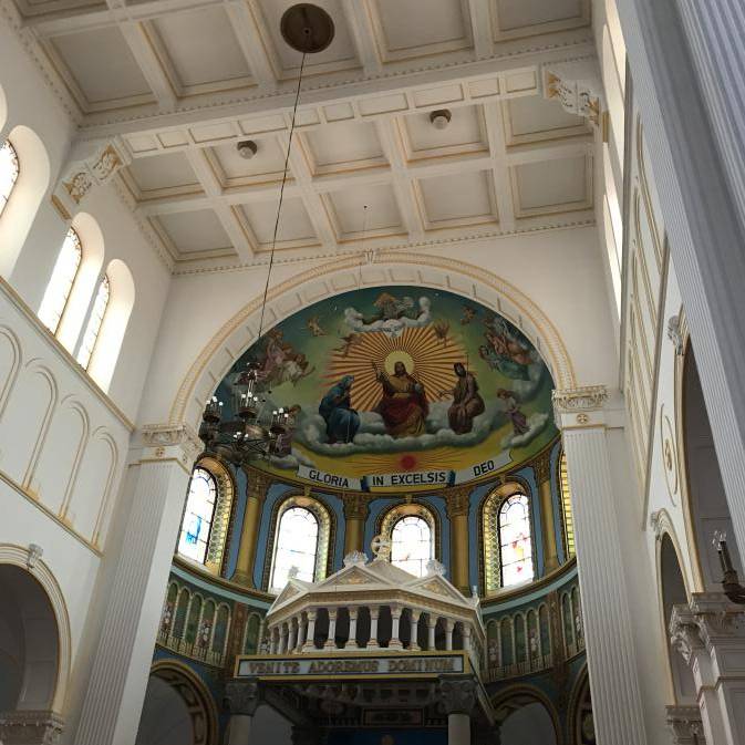如果说教堂外部让人感受到的是建筑被西方神秘文化紧紧包裹住的外壳,那么当你随着人流缓缓慢步进入教堂内部,呈现在你面前的景象足以让你眼前一亮。高大的屋顶,宽敞明亮的大厅,一个吊灯从顶棚直锤而下,仿佛指引着人们将目光从最高处集中于圣象壁画和祭台之上。虽说只是从前的人们用于宗教活动的地方,但无论是教堂里的壁画,还是教堂窗户玻璃的琉璃彩画,都不亚于精心描绘的艺术画。绘画也是一种音乐,建筑也是。圣弥厄尔教堂更是如同一首伟大的交响曲,在庄严宏大与细腻柔美两个声部的交融之中,我看到了千名教徒齐聚一堂,在虔诚地唱着圣歌。