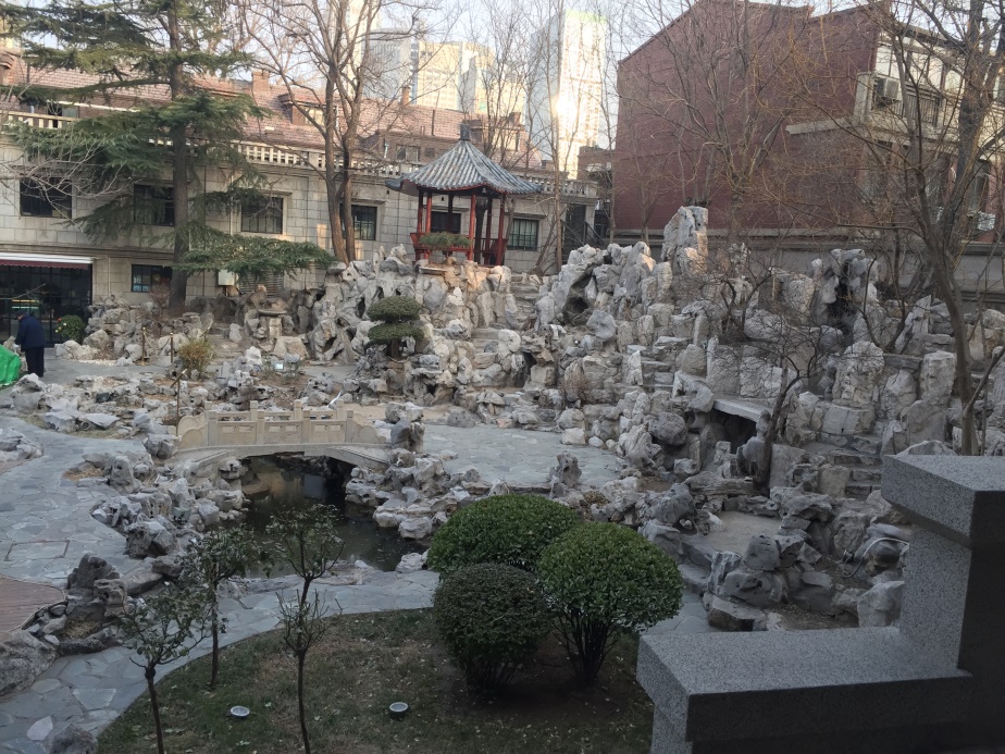 出了大厅,便看到两层外檐所设的通敞柱廊,建筑形体简洁明快,远眺是五大道上鳞次栉比、风格各异的建筑,俯瞰,则是充满中国古典韵味的园子。石桥、太湖石、六角凉亭、水法,精心雕琢之中却又透出闲适之情。假山叠石,徜徉院落,一动一静,一张一弛,这份威严之中的自在,令人恍若世外。