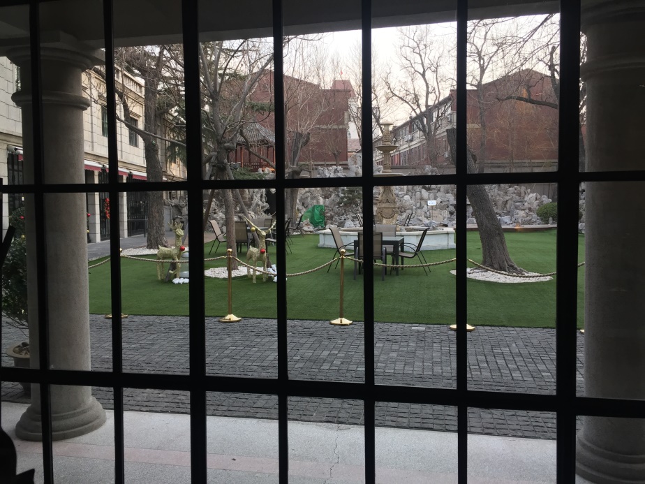 循着台阶下去,紧挨着中式园林的,就是西方的大草坪,粗壮的大树,精美的装点,摆上几桌,可以想象人坐在开放大气的草坪上,看着不远处的山石,中西造景手法融为一体,毫不违和。透过室内宽敞的方窗,也能看到这副景象,要不是天气不给力,配上点蓝天或是夕阳,都是难以描绘的美景了。