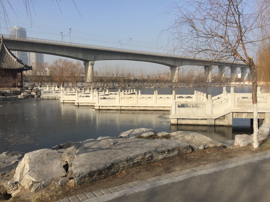 更有两千余米的长廊,堪与闻名世界的圆明园长廊媲美。园内湖渠聚合相宜,以几十座拱桥、曲桥、平桥贯连,沿岸遍植垂柳,楼亭错落,回廊蜿蜒,表现出若隐若现的园林情趣和自然优美的独特景观。不远处的立交桥看起来也不违和,平添了几分趣味。加之天公作美,虽是冬天,但宛如仙境。可惜时间不太充足,还是没能走到一进园就看到的白塔。下回有时间一定会再去的。