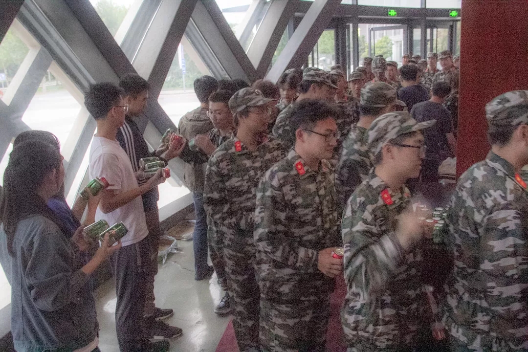 大会前夕,热心的学长学姐们为2018级新生送上饮料水果等军训慰问品。