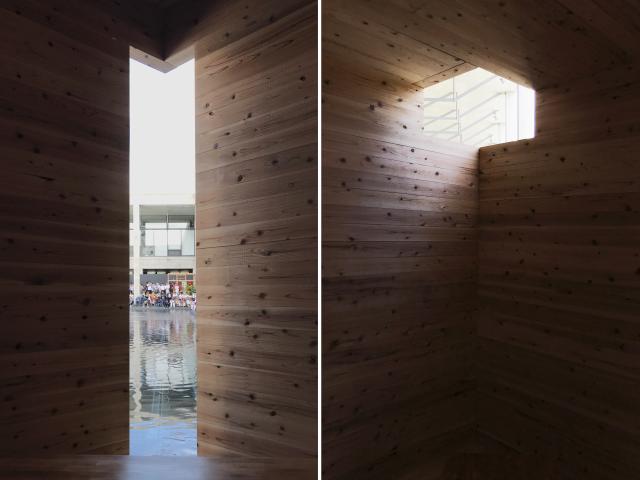 而与传统的茶室不同,本装置在越后妻有里山现代美术馆的回廊展出,可以说是“建筑中的建筑”。设计师最大程度的避免了出现建筑构件,通过大小、位置不同的洞口实现了建筑语言里的门窗等功能,使得整体更抽象也更纯净。这个装置像宇宙中的一个细胞一样,成为了整体艺术群的一部分。同时,通过细长的洞口还可以欣赏到美术馆中心庭院里由艺术家Leandro Erlich创作的艺术作品。