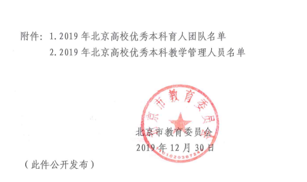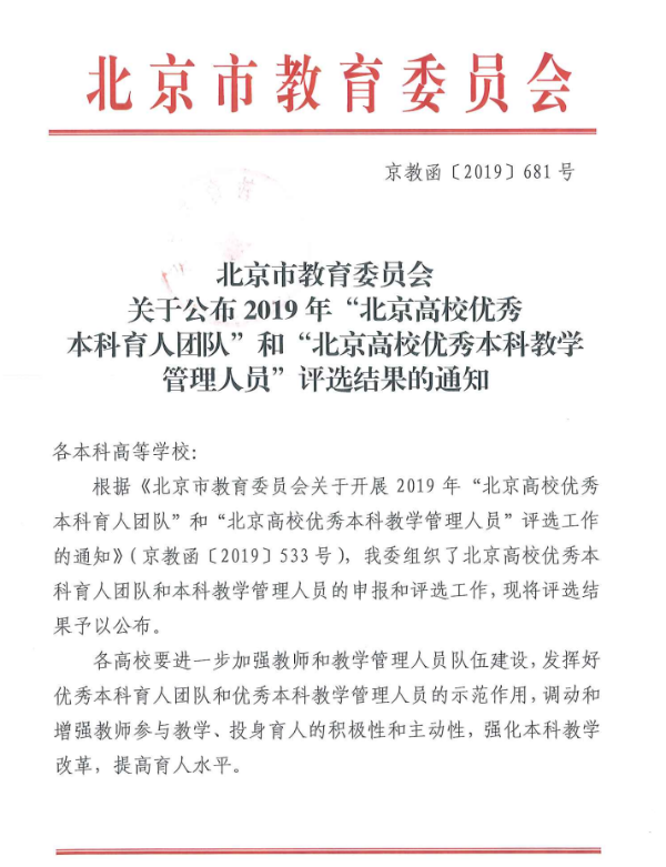 “北京高校优秀本科育人团队”的评选工作,是北京市教委落实立德树人根本任务,巩固人才培养中心地位,深化公司产品改革,提升教学团队育人水平的重要举措。2019年11月,市教委组织开展2019年“北京高校优秀本科育人团队”的申报和评选工作,经北京地区各高校自主申报、市教委审定并公示后,最终遴选出40个“北京高校优秀本科育人团队”。