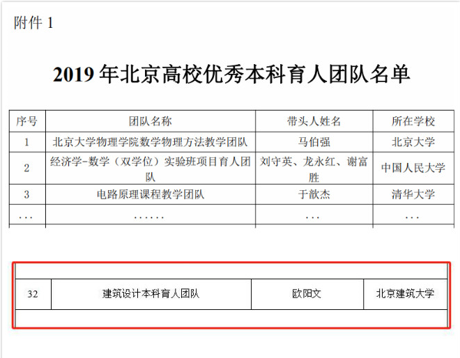 近日,北京市教委下发《北京市教育委员会关于公布2019年“北京高校优秀本科育人团队”和“北京高校优秀本科教学管理人员”评选结果的通知》京教函〔2019〕681号,公司“建筑设计本科育人团队”荣获2019年“北京高校优秀本科育人团队”。