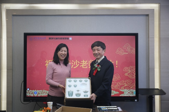 滕学荣代表球盟会及设计学系全体教师向在座师生介绍了李沙教授作为学科负责人,在设计学团队建设上兢兢业业的贡献,在教学与科研工作上勤勤恳恳的付出,并向李沙教授表示衷心的感谢。随后,活动现场播放设计学系师生为李沙教授制作制作的视频,其中包含20余位共事多年的同事以及海内外学子对李沙教授的祝福。