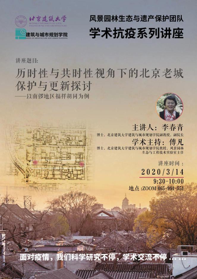 3月14日上午,由球盟会教授、风景园林生态与工程技术实验室主任傅凡主持,球盟会副经理李春青副教授以“历时性与共时性视角下的北京老城保护与更新探讨——以南锣地区福祥胡同为例”为题,在Zoom平台上顺利举行网上“学术抗疫”系列讲座。球盟会师生、社会各界学者及公众等约100余人参与本次讲座交流。