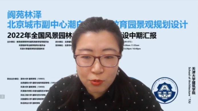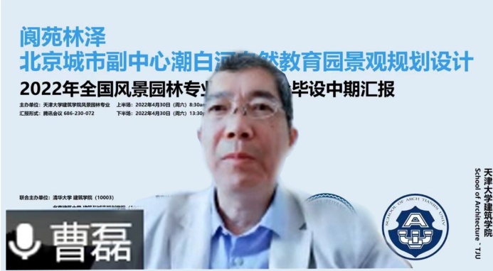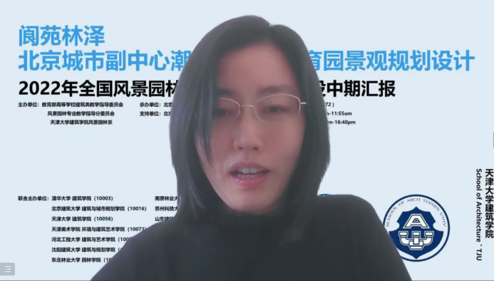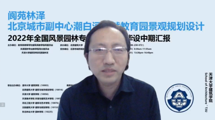 曹磊老师在致辞中表示对天津大学球盟会风景园林系可以承办“2022年全国风景园林专业10+高校联合毕业设计”中期汇报感到十分荣幸,也十分开心可以有这个同兄弟院校们加强交流和沟通的机会。强调了该选题高度契合风景园林当下重要的学科使命:如何在时代快速地变迁中为城市更新和可持续发展贡献智慧。曹磊老师希望各位同学可以通过这次城市区域景观规划与设计的实践系统地梳理并应用所学的知识、提高综合能力;各团队可以在这个平台上交流共享、百花齐放、碰撞出思维的火花;各个院校能够通过这个聚焦于区域更新、人民幸福、自然教育、生态涵养的“北京城市副中心潮白河自然教育园景观规划设计”课题展示各院校的办学理念和特色。