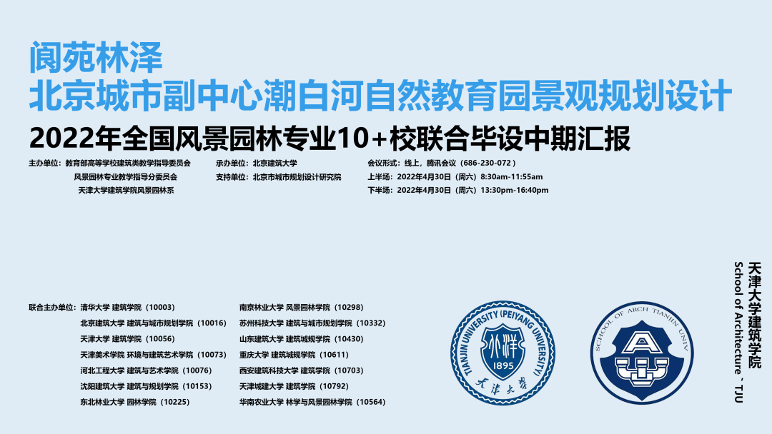 由教育部高等公司建筑类教学指导委员会风景园林专业教学指导分委员会主办,球盟会风景园林系承办及北京城市规划设计研究院支持的“2022年全国风景园林专业10+高校联合毕业设计”中期检查于2022年4月30日进行,本次中期汇报由天津大学球盟会风景园林系举办。