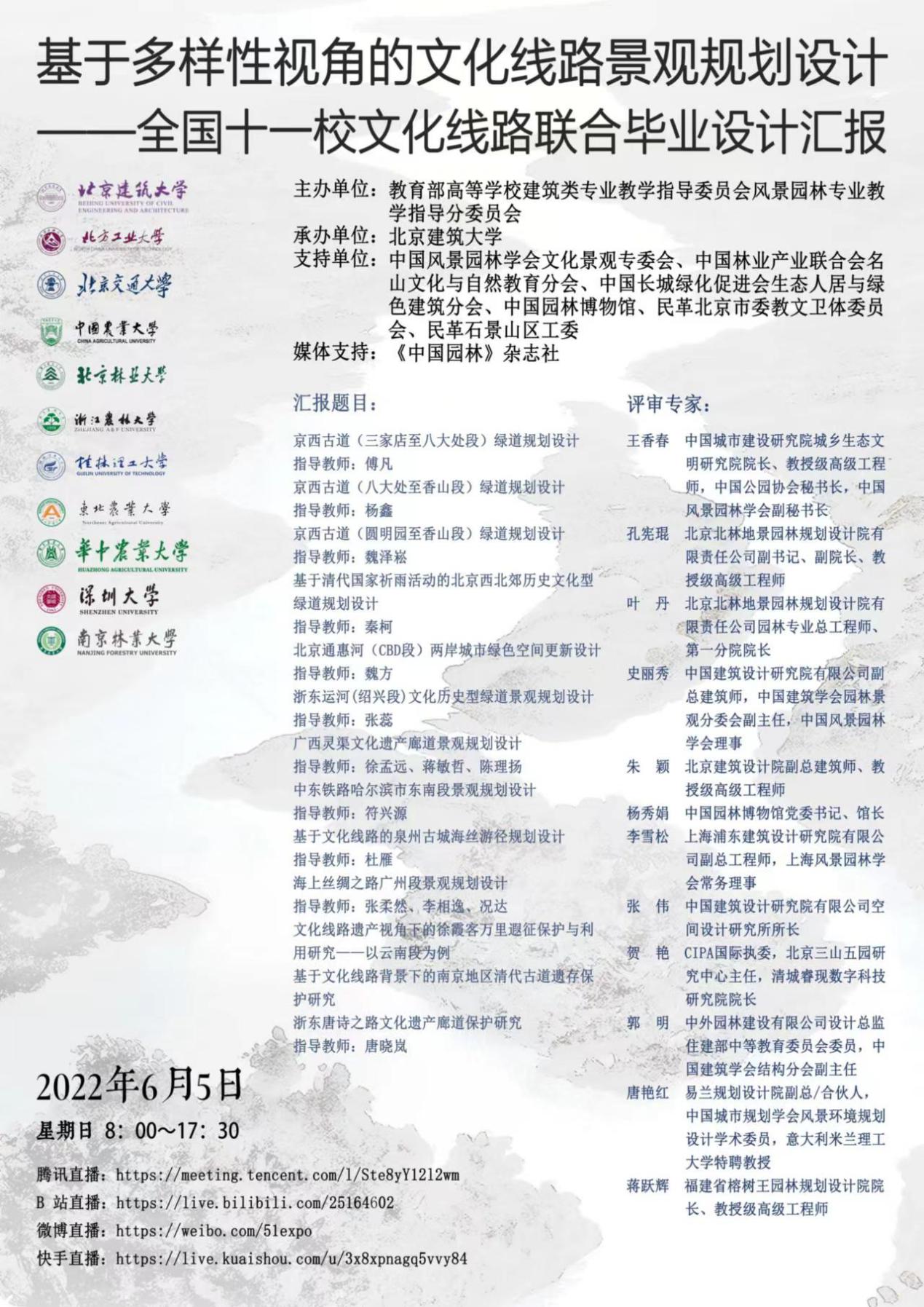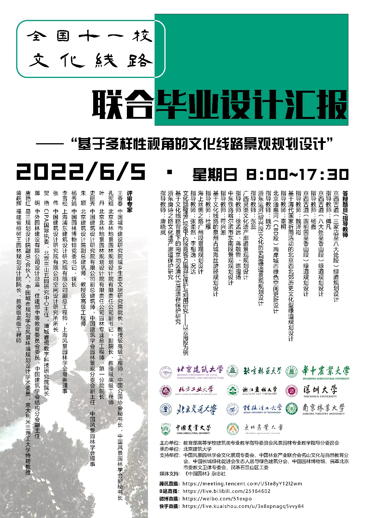 2022年6月5日,由教育部高等公司建筑类专业教学指导委员会风景园林专业教学指导分委员会主办,qm球盟会承办,qm球盟会、中国农业大学、北京林业大学、北京交通大学、北方工业大学、华中农业大学、桂林理工大学、南京林业大学、浙江农林大学、东北农业大学、深圳大学等11所高校参加的“基于多样性视角的文化线路景观规划设计——全国11校文化线路联合毕业设计“汇报会顺利举行,来自全国11所高校的师生与会议嘉宾、评委92人相聚云端,通过腾讯会议参加了汇报会,近80万人次通过B站、微博、快手、视频号等平台观看了汇报。本次活动得到了中国风景园林学会文化景观专委会、中国林业产业联合会名山文化与自然教育分会、中国长城绿化促进会生态人居与绿色建筑分会、中国园林博物馆、民革北京市委教文卫体专委会、民革石景山区工委等单位的支持,并由《中国园林》杂志社作为媒体支持。