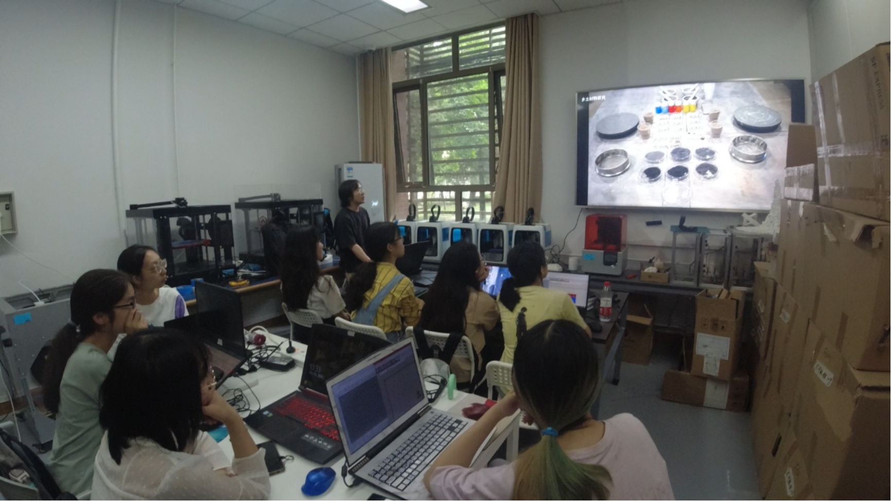 7月27日下午,朱冠奇博士首先以两个grasshopper瓶子模型为例,对电池组及曲线函数的操作方法进行了讲解,表示通过grasshopper中的参数控制瓶的高度,瓶身整体的大小,瓶的开口形式、整体形状以及纹理等,并指导同学们调整参数,形成不同的瓶子形态。然后朱冠奇博士对模型的存储方式及格式调整进行了演示。随后,郝石盟老师、朱冠奇博士和刘国刚博士带领同学们移步实验室,以同学们制作的模型为例,对陶土3D打印机器的操作方式进行了现场演示。