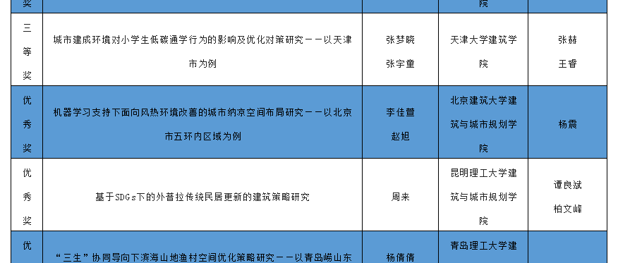 由杨震指导、城乡规划2021级硕士生李佳萱和城乡规划2021级硕士生赵旭同学完成的参赛论文《机器学习支持下面向风热环境改善的城市纳凉空间布局研究——以北京市五环内区域为例》荣获硕博组优秀奖。风热环境的改善可有效减少夏季制冷需求及其碳排量,论文以北京市五环内区域为例,采用地理加权回归、机器学习BP神经网络、CFD数值模拟等方法,研究了植被与水域覆盖率、建筑密度、容积率等城市开发要素对风热环境的影响,并提出优化建议。