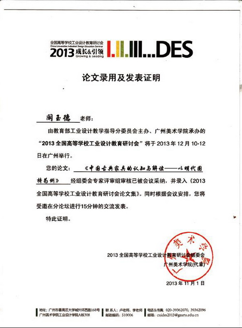 球盟会教师阚玉德的论文《中国古典家具的认知与解读-以明代圈椅为例》获得宣讲论文。在12日上午的论文交流会上进行了15分钟的汇报演讲,与现场人员进行了研讨。