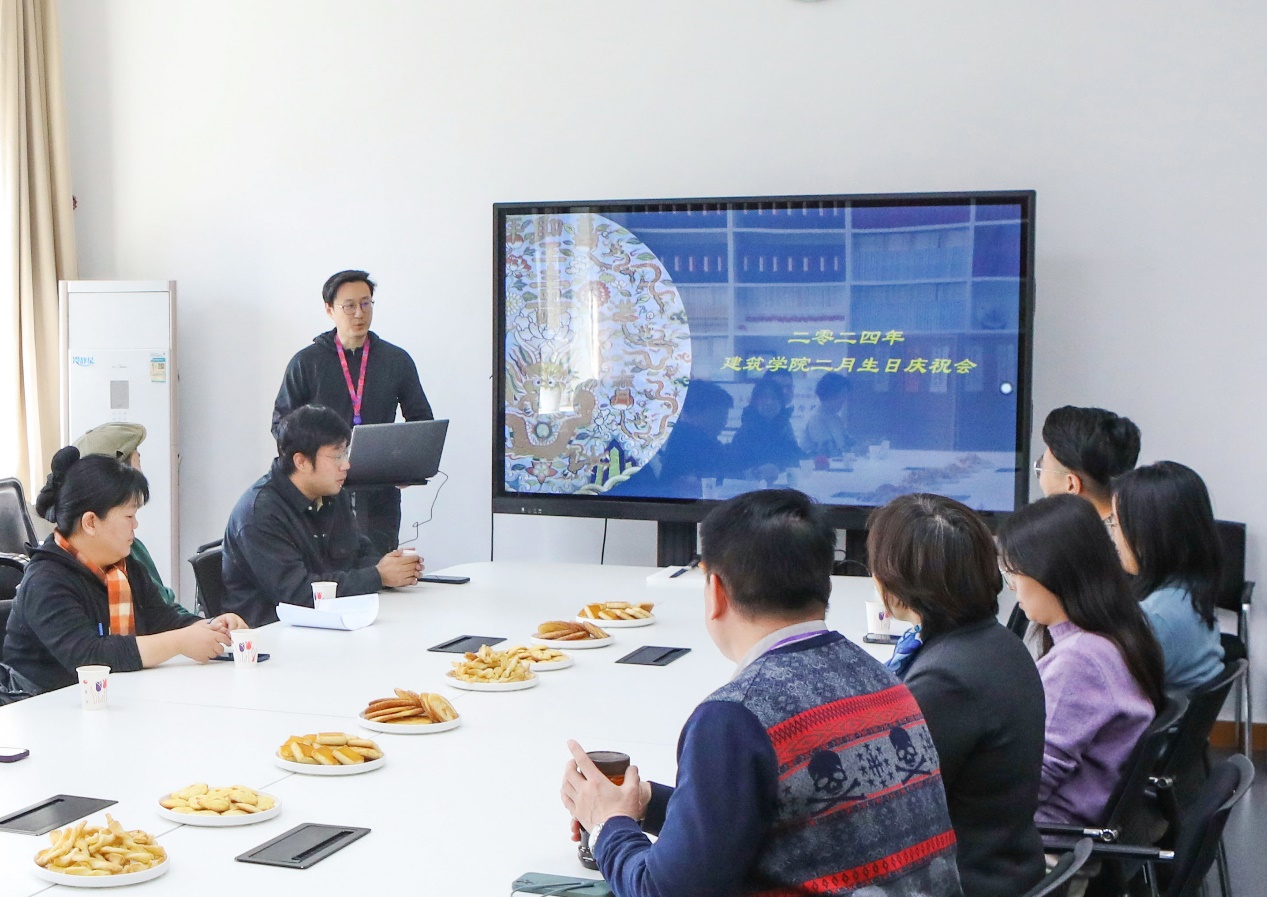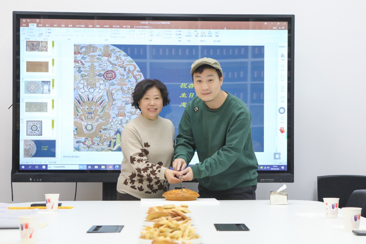 本次生日会由设计学系青年教师吕帅担任主持人,由高晓路教授担任颁发贺卡嘉宾。吕帅老师以中国传统装饰纹样为巧思,将到场庆生的寿星名字一一蕴含在不同吉祥纹样之中,借纹样之美送出别样祝福。杏花飞燕纹、朵朵梅花蜜蜂纹、飞鱼纹、云气纹、敦煌纹样、蟾宫玉兔女仙纹……老师们在猜纹样互动的同时,传递着对庆生老师们美好的祝愿,传承着对中华传统文化与美学的热爱,现场氛围温馨、欢快。
