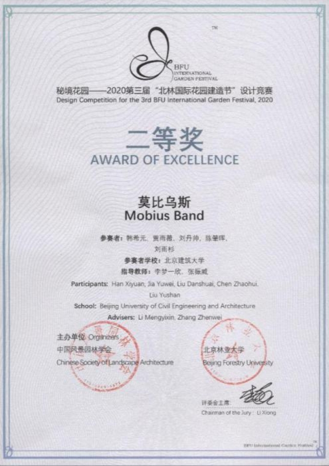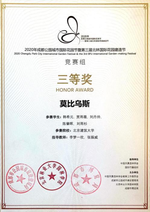 球盟会由张振威老师和李梦一欣老师指导风景园林2017级本科生刘丹帅、刘雨杉、韩希元、陈肇晖、贾雨薇组成的队伍经过层层筛选分别斩获了2020第三届“北林国际花园建造节”设计竞赛二等奖和 “2020年成都公园城市国际花园节暨第三届北林国际花园建造节”竞赛组三等奖。