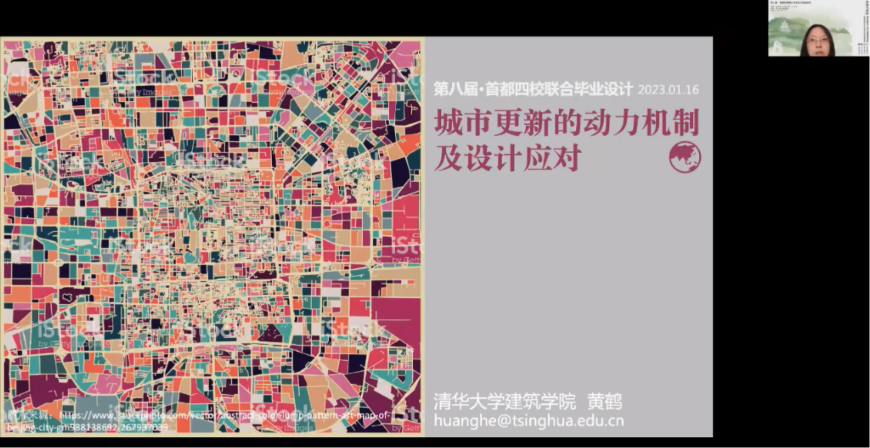 其次,各校带队老师针对毕设题目进行解析。此次联合毕业设计以“包容与韧性——后疫情时代北京城乡空间更新探索”为主题,分析北京当前、后疫情时代的城市问题,为未来建设包容与韧性的城市空间提出规划设计策略。围绕这一主题,四校指导教师分别选择不同地块,以不同视角提出不同规划设计内容,为未来服务首都高质量发展出谋划策。此次联合毕业设计的题目包括:“海淀清河滨水空间更新设计”;“丽泽商务区D片区城市设计” ;“北京通惠河CBD段及周边空间更新设计研究”;“天坛地区西草市红庙街区(院落)保护与更新设计”四个题目。