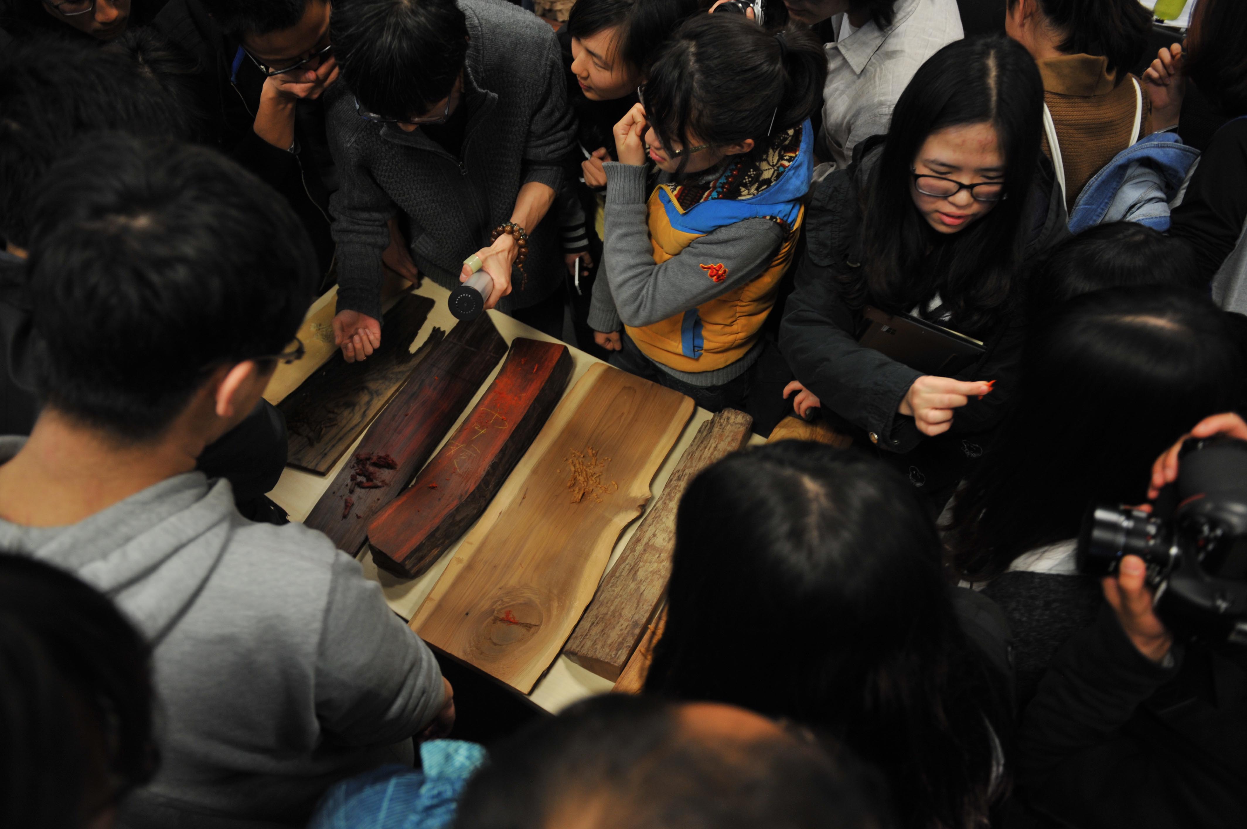 演讲结束后,梁先生邀请现场的观众上前观赏带来的9件家具和各类木材,现场摆放的手作家具艺术级作品和多种罕有原木材料同学都难得一见。如此近距离的观赏、动手把榫卯结构拼拆解剖、从视觉、嗅觉、触觉感受材料,多角度理解传统工艺,这样的机会让现场的同学欣喜不已,多位同学在现场观摩体验,迟迟不愿离去。
