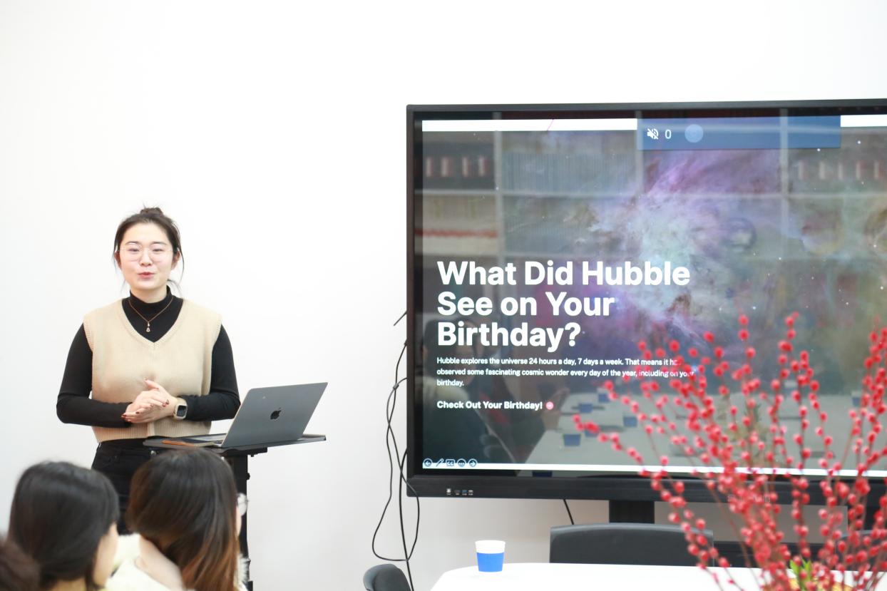 随后,王佳煜老师为每位寿星展示了独具特色的宇宙星象,包括由哈勃望远镜在各位老师生日当天拍摄的宇宙图像,以及生日当天的月相,并定制了相应的书签作为小礼品送给各位老师。老师们在宇宙中找到了生日当天专属的浪漫宇宙,如大麦哲伦星云、恒星、彗星、矮星系、林赛-沙普利环星系等,每位“寿星”获得了独一无二的宇宙印象。王佳煜老师也为各位老师送上祝福,希望老师们既有“把论文写在祖国大地上”的踏实,也有“仰望星辰大海”的浪漫。