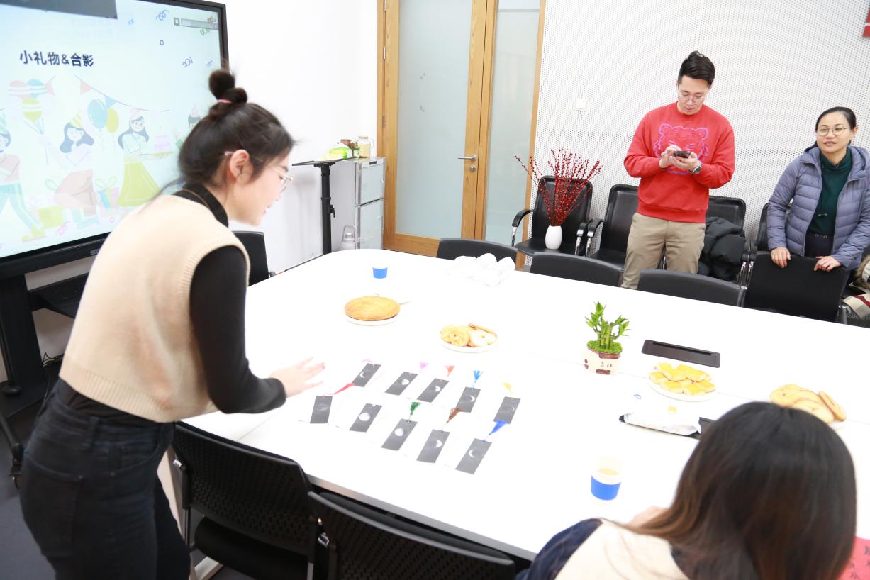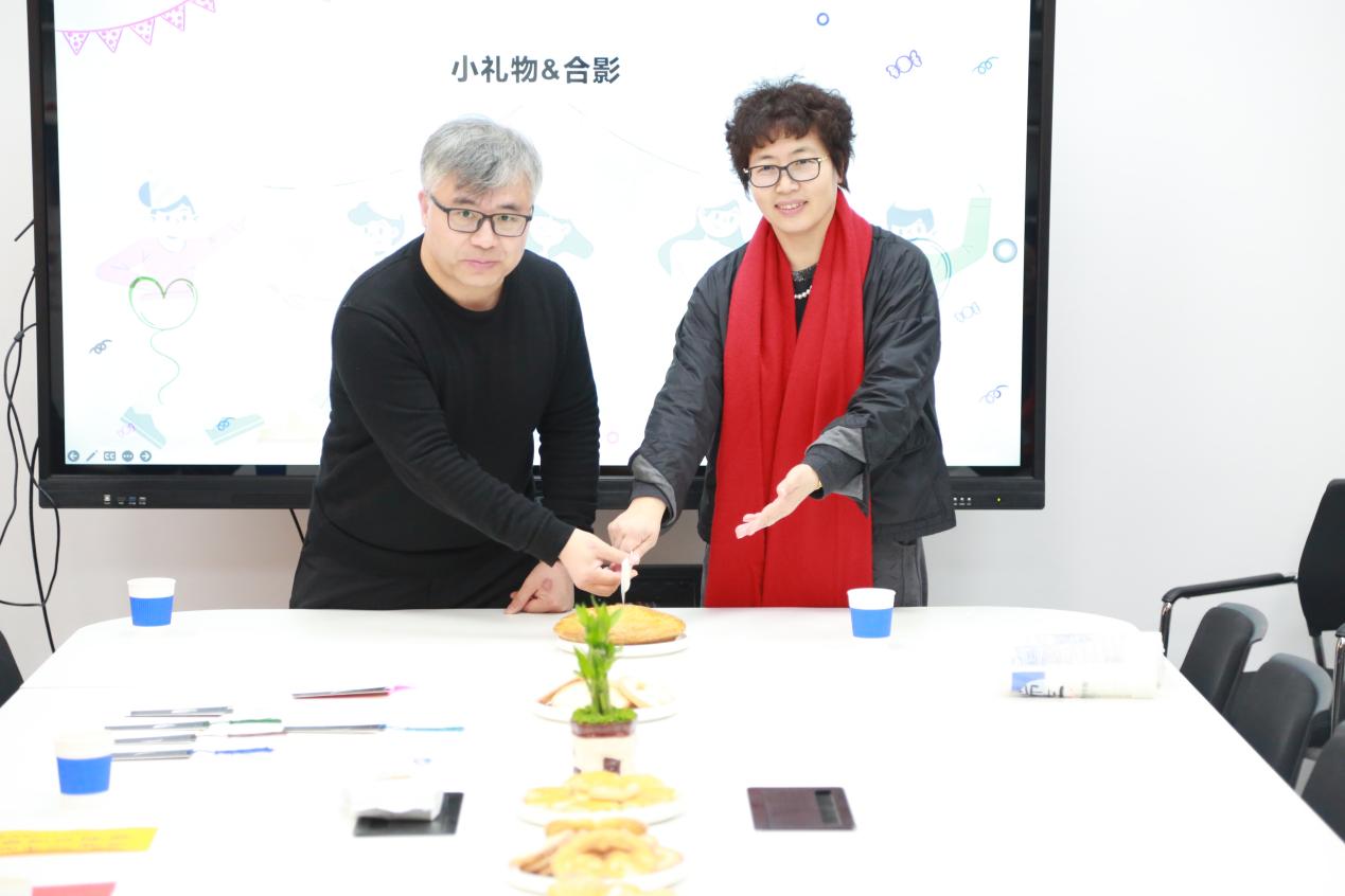晁军老师与荣玥芳老师代表所有一月过生日的老师们上台切下苹果派的第一刀,谭鑫老师与王文欣老师细心地将苹果派分成小块,送到大家手中,老师们一边品尝着中关村茶点铺的糕点,一边分享生日祝福,甜甜的糕点映着甜甜的笑脸,会议室的各个角落都洋溢着幸福与微笑。