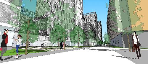 适度增加地上建筑面积,提高土地利用效率,延续中间低两边高的布局,突出中轴线关系,创造优美的天际线。
