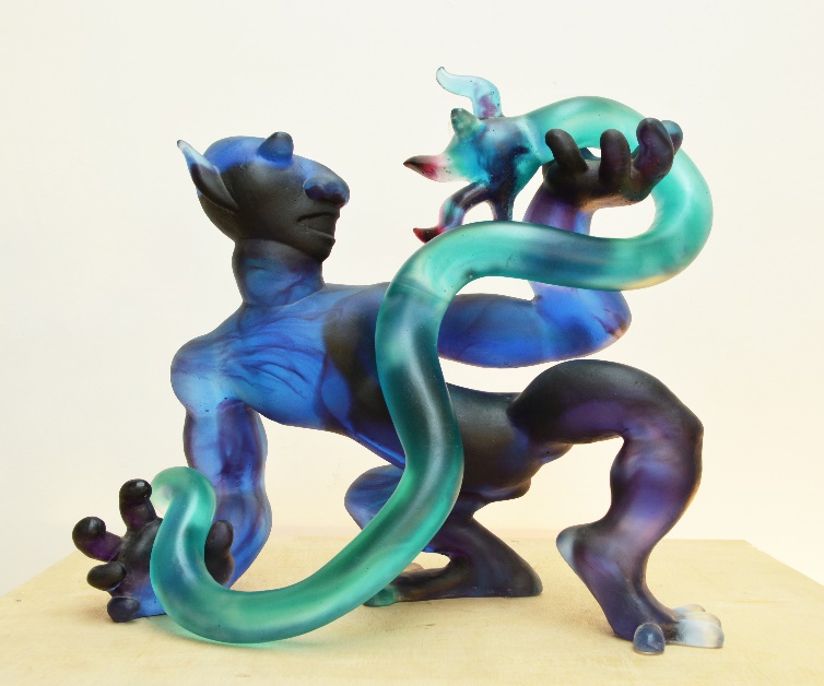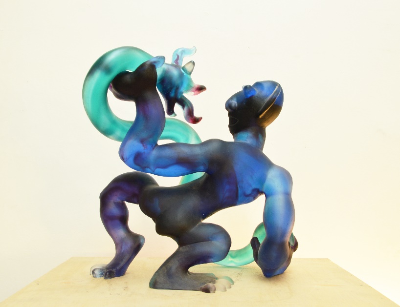 球盟会实验中心青年教师李振宁创作的作品《与梦共舞》在本届中国当代工艺美术双年展中展出。该作品为玻璃雕塑作品,作品通过具象地表现手法来进行创作,是现实与想象的结合物,形体上长着如同人物的脸庞,营造出戏剧性的情节。
