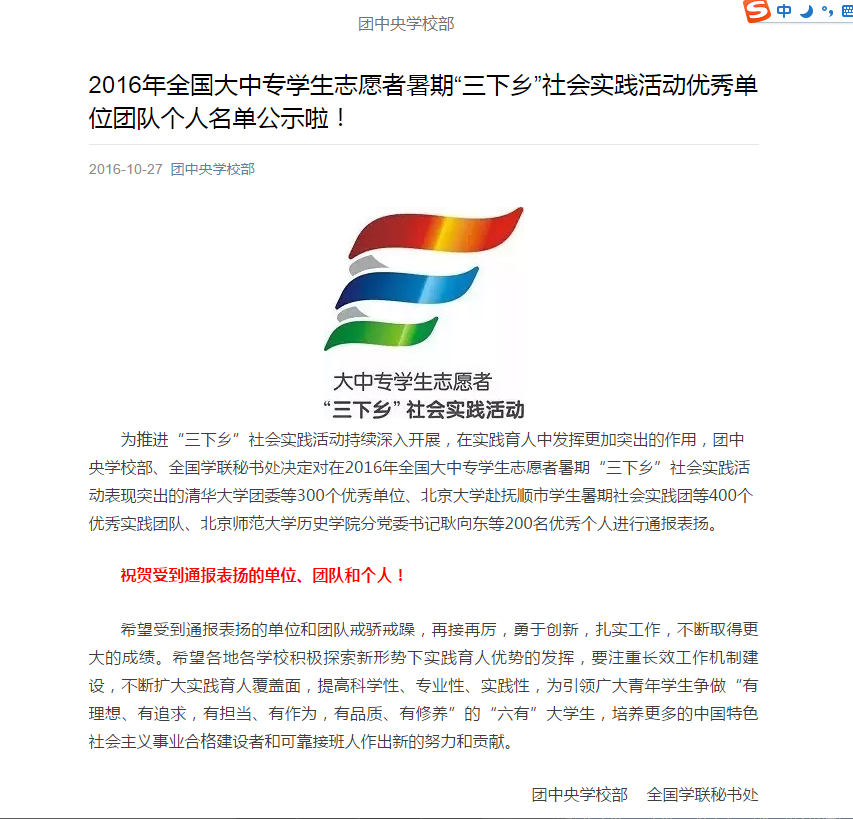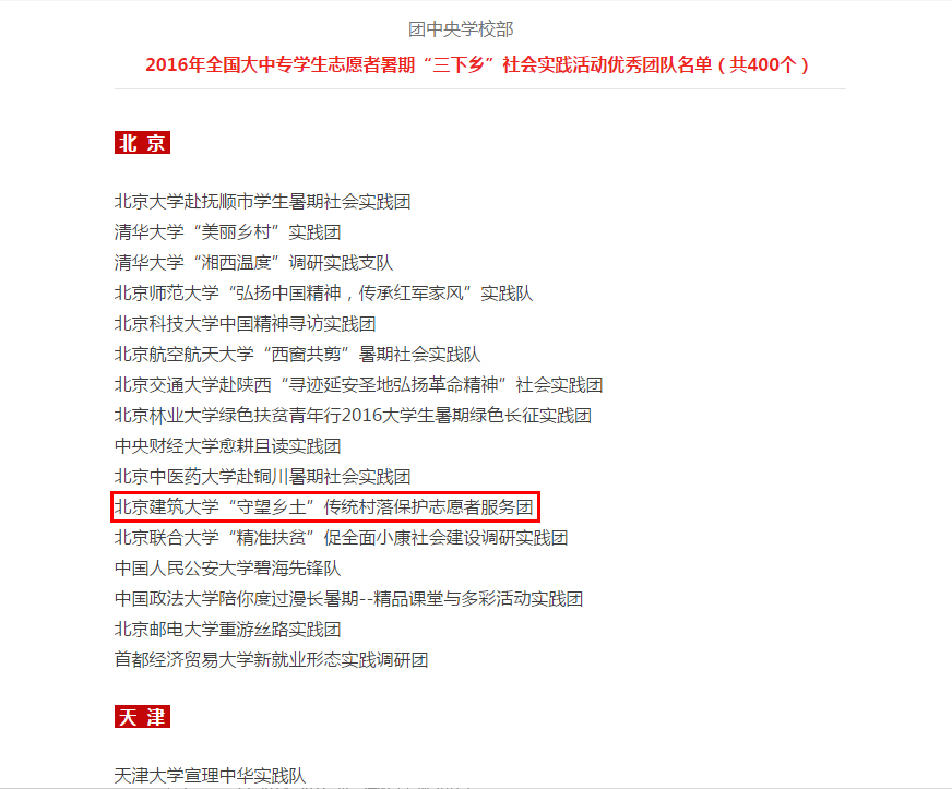 10月27日,从共青团中央、全国学联传来喜讯,球盟会“守望乡土”传统村落保护志愿者服务团队获评2016年全国大中专员工志愿者暑期“三下乡”社会实践活动优秀团队!北京地区共有15所公司的16支实践团队获此殊荣。