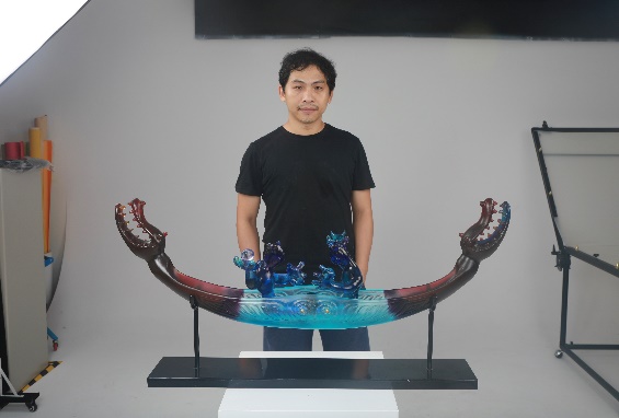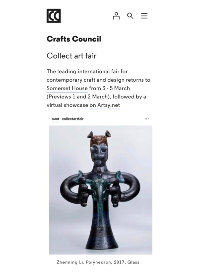 同时,李振宁老师通过积极参加各种国际艺术展览和交流活动来响应和实践中华文化走出去的国家号召。2023年3月,继2022年英国玻璃艺术双年展后,他收邀参加由英国手工艺协会主办的国际著名艺术大展:Collect Art Fair,两件作品《多面体》、《太阳船》参展。“Collect Art Fair”是两年一届的世界顶级手工艺艺术博览会,在伦敦著名的索默塞特宫举办。其中,李老师的玻璃雕塑作品《多面体》作为“Expanding Horizon”中日韩三国参展单元的代表作品出现,并被英国RMT艺术机构收藏。