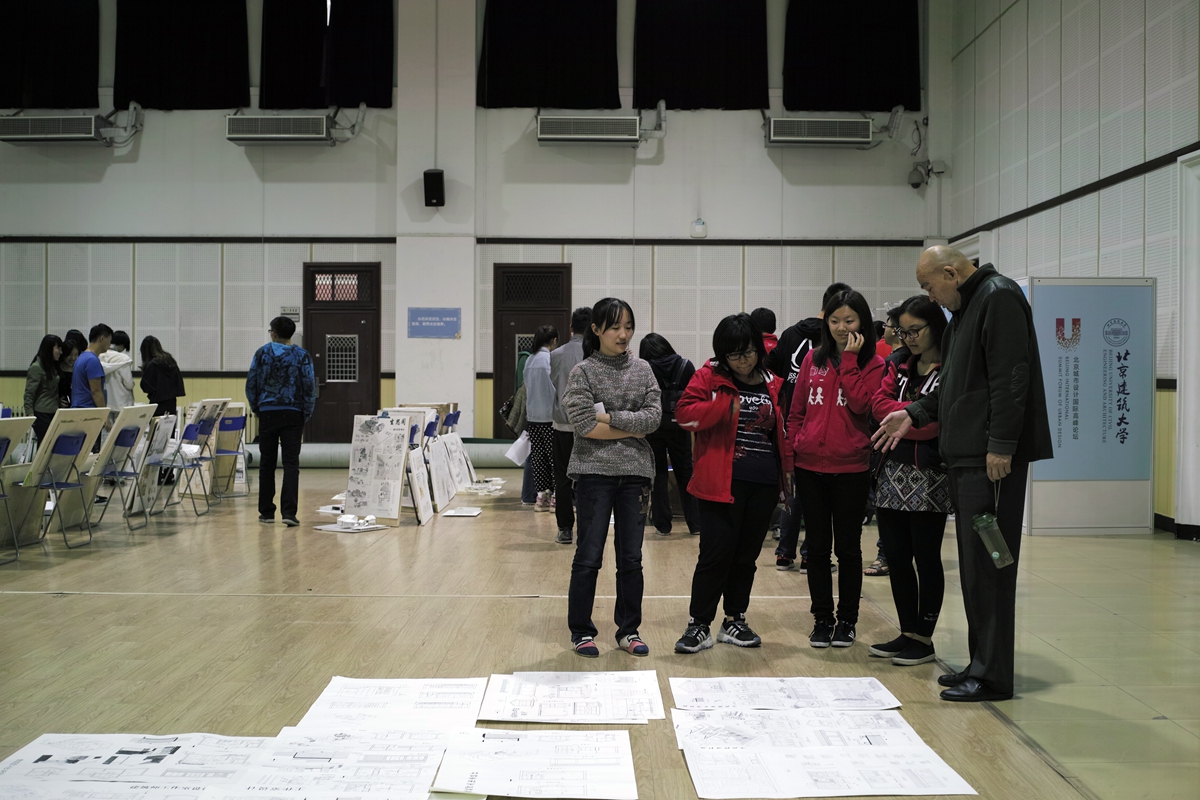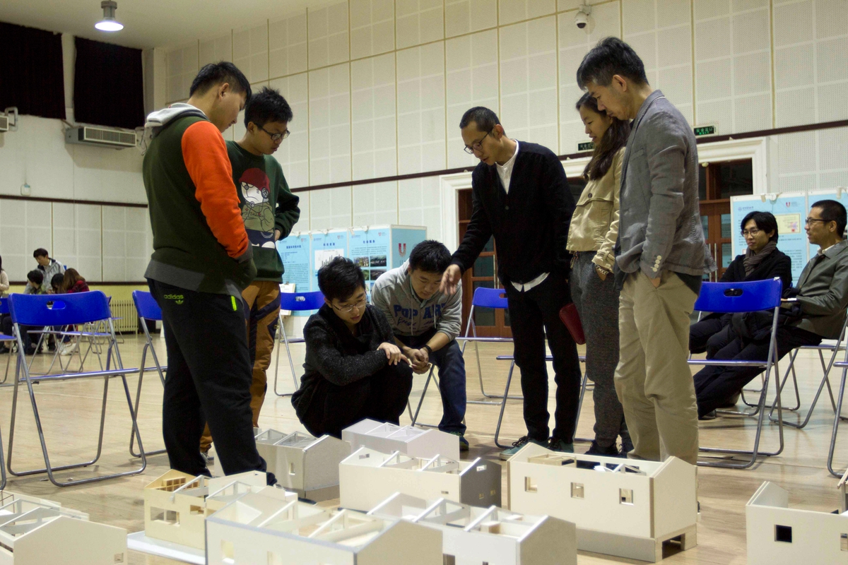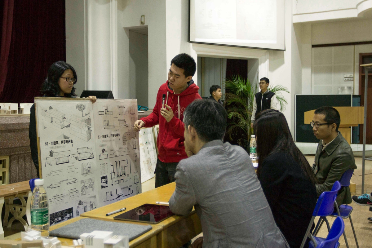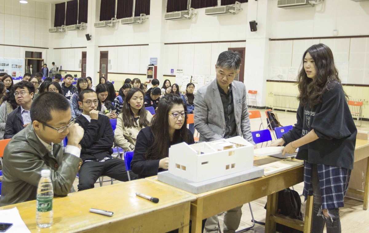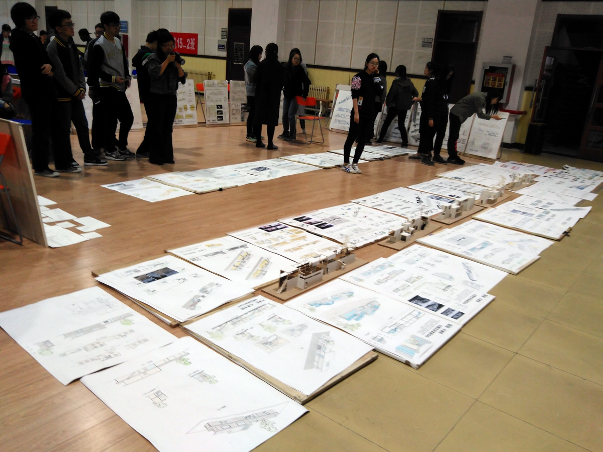 但是对建筑设计课程来说,一是我国原有的建筑设计教育长期以来多侧重建筑功能布局与形式美学的推敲,对建筑的实际工程建造和社会需求关注不足;二是建筑设计教育的教学组织通常是侧重高年级设计课的校外建筑师评图、多校联合毕业设计、设计院实习等环节,对低年级设计教学的工程性、建造性和社会性重视不足;三是公司西城评图空间比较紧张,没有大型的多班级多年级联合评图的公共空间,因此原先的多采用的各班班内评图或少量班级合班评图的情况并不能充分地实现评图在设计教学中的重要作用。因此,本次评图进行了三大方面的改革:一,申请启用老员工活动中心大空间开展九班联合评图,实现九个班级作业“共评”;二,评图的过程也是图纸和模型甚至师生交流情境的展示过程,促成多课题多专业作业“共展”;三,邀请社会上的资深从业建筑师参与设计教学与评图,促成教师之间、师生之间、同学之间的“共融”。
