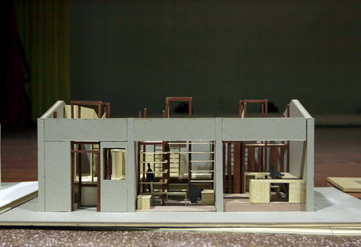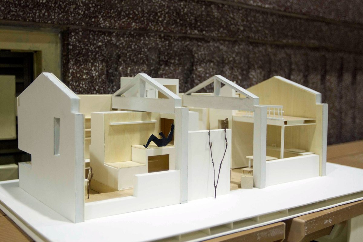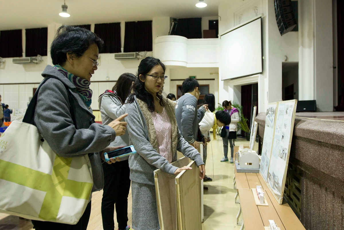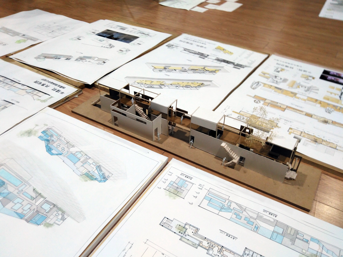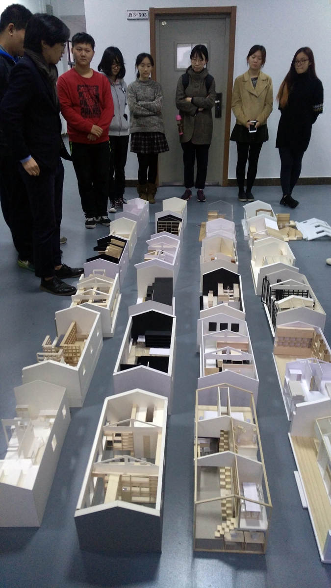 但是对建筑设计课程来说,一是我国原有的建筑设计教育长期以来多侧重建筑功能布局与形式美学的推敲,对建筑的实际工程建造和社会需求关注不足;二是建筑设计教育的教学组织通常是侧重高年级设计课的校外建筑师评图、多校联合毕业设计、设计院实习等环节,对低年级设计教学的工程性、建造性和社会性重视不足;三是公司西城评图空间比较紧张,没有大型的多班级多年级联合评图的公共空间,因此原先的多采用的各班班内评图或少量班级合班评图的情况并不能充分地实现评图在设计教学中的重要作用。因此,本次评图进行了三大方面的改革:一,申请启用老员工活动中心大空间开展九班联合评图,实现九个班级作业“共评”;二,评图的过程也是图纸和模型甚至师生交流情境的展示过程,促成多课题多专业作业“共展”;三,邀请社会上的资深从业建筑师参与设计教学与评图,促成教师之间、师生之间、同学之间的“共融”。