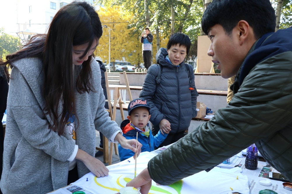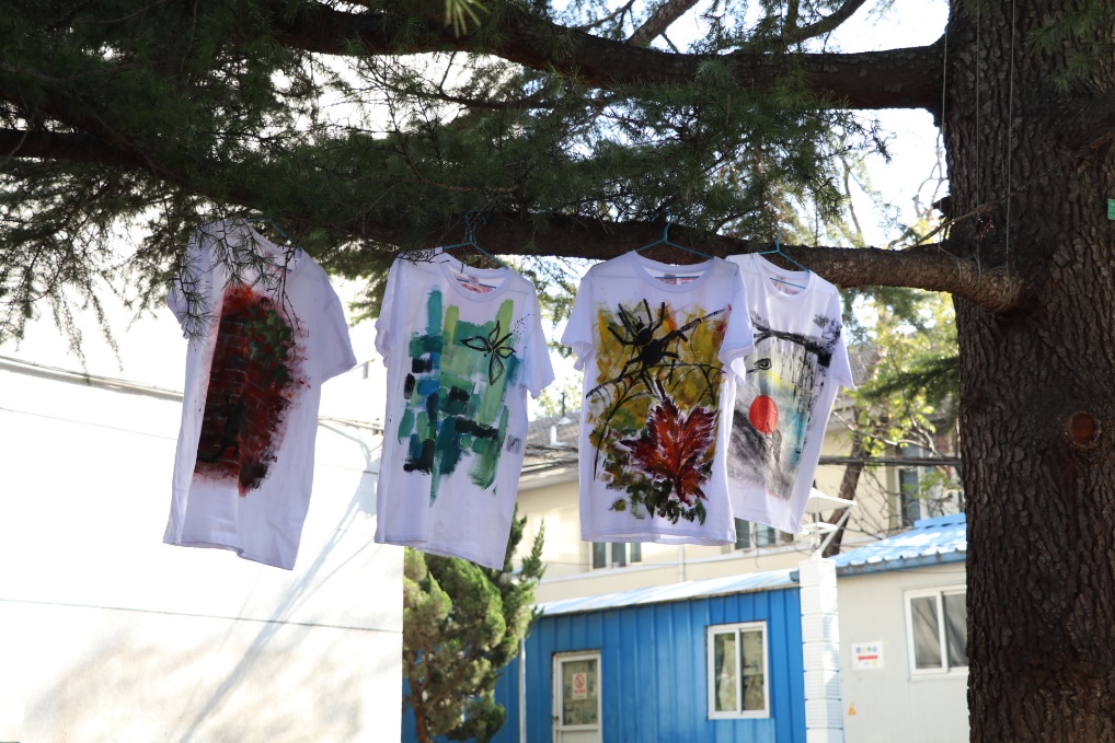 活动结束,大家纷纷与自己的作品合影留念,有的组还将衣服悬挂在场地旁边的树枝上,随风飘动的手绘T恤,集合着校园各处建筑景观的手绘T恤,成了校园里亮丽的风景线。