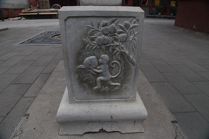 一行人进入白云观,夺目而入的便是山门。山门为石砌的三券拱门,三个门洞象征着“三界”,跨进山门就意味着跳出“三界”,进入神仙洞府。山门石壁上雕刻着流云、仙鹤、花卉等图案,其刀法浑厚,造型精美。中间券门东侧浮雕中隐藏着一个巴掌大小的石猴,已被游人摸得锃亮。漫步前行,靠近山门前左右矗立一个高约三、四米左右的华表。插之苍穹,浮云如罗带,上刻有祥云,顶端垄有小石狮,怒目而视,似腾蛟起凤。