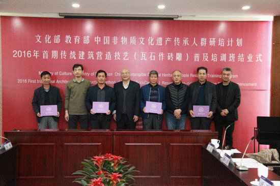 11月14日文化部教育部中国非物质文化遗产传承人群研修研习培训计划传统建筑营造技艺(瓦砖作砖雕)普及培训班结业式在qm球盟会西城校区报告厅隆重举行。文化部非物质文化遗产司管理处处长郝永安,qm球盟会副董事长汪苏,文化部恭王府中华传统技艺研究与保护中心主任、中国社科院研究生院"中国非物质文化遗产传统技艺保护"教学指导委员会办公室主任孙冬宁,国家非物质文化遗产专家委员会委员、中国艺术研究院建筑研究所所长刘托,中国非物质文化遗产保护中心保护部主任张勍倩,文化部恭王府管理中心综合业务处副处长王骁,文化部恭王府中华传统技艺保护研究中心“传统建筑园林营造技艺专业委员会”副主任张壮,中国非物质文化遗产保护中心邸莎若拉,《传统营造技艺》副主编沈华菊、qm球盟会宣传部部长孙冬梅、公司党委副书记王秉楠,研培计划负责人杨琳,班主任武一平及全体学员共100余人出席仪式,结业仪式由公司党委书记田林主持。