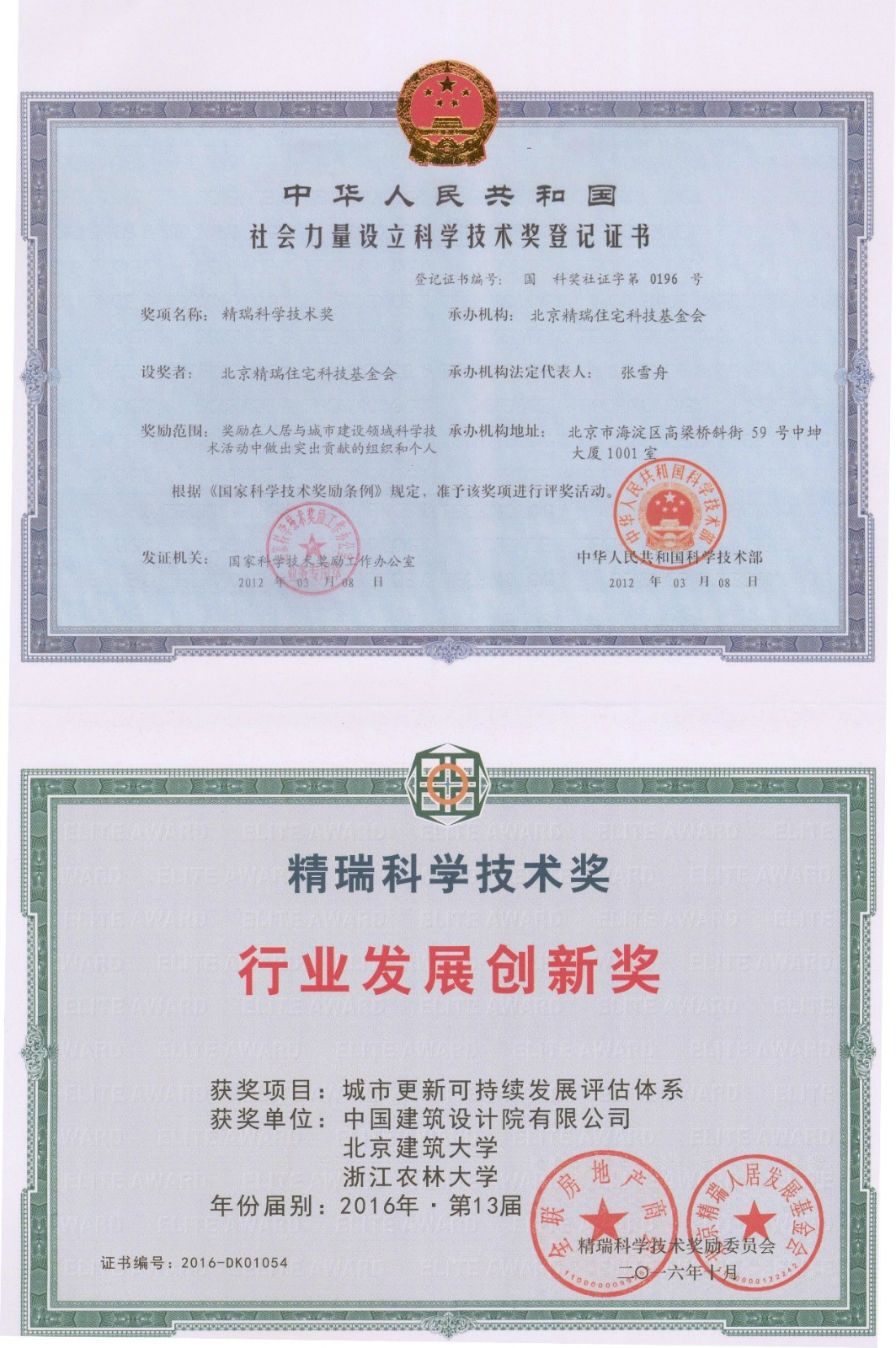 2016年10月19日,第13届精瑞科学技术奖颁奖典礼在北京富力万丽酒店隆重举行,公司刘剑锋副教授与中国建筑设计院有限公司、浙江农林大学共同参评的科技成果“城市更新可持续发展评估体系”荣获“行业发展创新奖”。