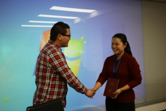 交流环节结束后,公司辅导员王国亭老师首先代表公司领导对华通国际长久以来的支持表示感谢;并代表球盟会就业联盟为华通国际人力资源部经理常桂花颁发聘书,聘请常经理为球盟会就业联盟“就业指导、生涯规划”校外导师。“就业指导、生涯规划”校外导师的聘任,将为球盟会学子的成长成才和就业联盟的发展加油助力。