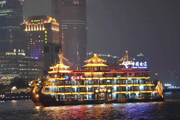 从万国建筑群边拾级而上,景色已全然换了模样。涛涛黄浦江兀自东流,在我未知的千年里,曾上演了多少国仇家恨和悲欢离合,又造福了多少黎民百姓于航运或渔业。今天,她的容貌给世人的又多一种妆容,那就是她的景色把这座城市装点的若玉带绕青峦,如碧镜映羞花。游兴未尽,黄昏已至。不想,夜晚的外滩竟如琉璃般璀璨,大小游船竞相上演灯火的盛宴,巨大的游轮在灯光的映射下如蝉翼般透明又虚幻。坐在船上,两岸各式建筑依岸而起,寸土寸金的楼群更在夜晚绽放出流光溢彩,美轮美奂如置仙境。这时,一切都似乎远离了,唯有这灯影,这江水。恰如,红尘皆世外,伤情不相拥。