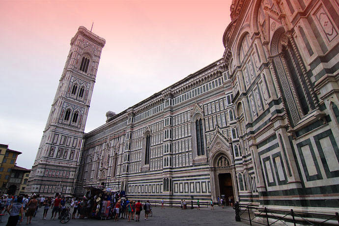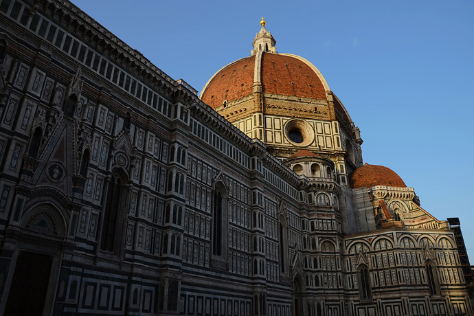 如果说新圣母教堂让艾吉奥感动于其的简洁而精巧的美感,那么花之圣母大教堂就让我知道并叹服于艺术的秩序美。是的,于我而言它就是一个艺术品,一个需要175年时间养育的孩子,一个可以精致美丽到匪夷所思的地步。它美,美在各处优雅壁画装饰,美在“鱼刺式”的结构架式,从下往上逐次砌成,美在能使用鼓座,全部表现出来阳光下穹顶的圣洁。同时也成为整个城市轮廓线的中心,也是城市的灵魂栖息地。怪不得百年之后,米开朗基罗在罗马圣彼得大教堂也建了一座类似的大圆顶,却自叹不如:“我可以建一个比它大的圆顶,却不可能比它的美。”我在佛罗伦萨所见过的庄严雄伟的教堂很多,但从未见过教堂能如此妩媚。这座使用白、红、绿三色花岗岩贴面的美丽教堂并不庄严古板,反而是…古典、优雅、自由,我想见到它的人体会的不是天主的威严,而是母性的光辉,难怪会被命名为“花之圣母”。