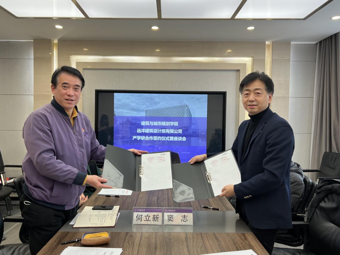 球盟会与远洋建筑设计院有限公司达成初步合作意向,窦志和何立新分别代表双方签署产学研合作框架协议书。