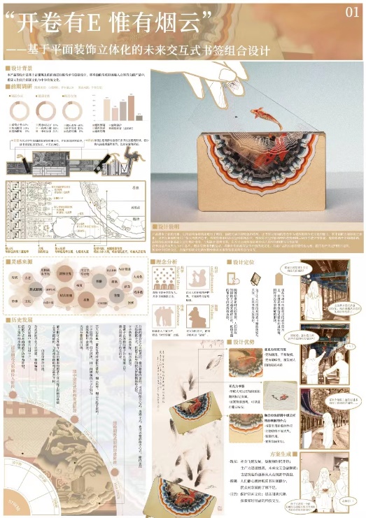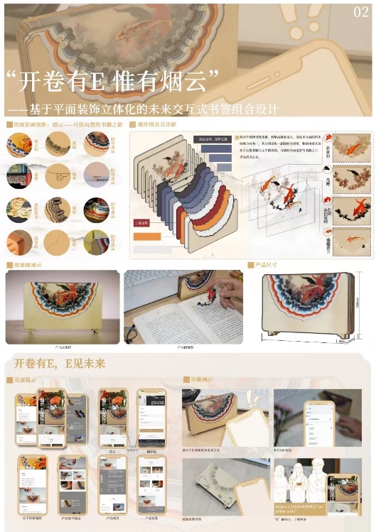 图6 环设221孙晨曦、李纪萱、黄睿同学银奖作品《“开卷有E,惟有烟云”——基于平面装饰立体化的未来交互式书签组合设计》