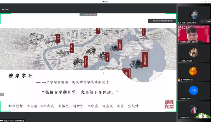 陈志端老师组刘明昊等六位同学以“柳岸学社——产学融合视角下的杨柳青学镇城市设计”为主题,深入贯彻“杨柳青岸勤学思,文昌阁下乐闻道”理念:柳岸体现在场地区位,再塑“北柳南桃”,展现对生态的重视和对民俗特色的反映;学社则是产学融合背景下的学镇发展新模式,通过嵌入国学体验、运河文创、科创新地以及产学基地,打造新型文创学镇并对接国家文化公园。耿宏兵秘书长和各校老师们对汇报提出了宝贵建议,认为该方案思路清晰、方案成熟,依托杨柳青古镇引申到规划区的功能定位,因此形成的策略有较强针对性;在接下来的深化中,如何为本地居民带来利益、为周边地区带去活力,是该小组在后期所要面临的课题。