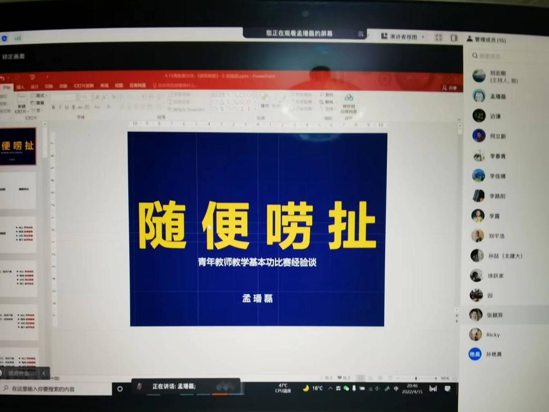 为了提高球盟会青年教师的教学能力,球盟会青年教师基本功比赛初赛结束后,公司于4月15日晚举办线上经验交流会,特别邀请第十三届北京市青年教师教学比赛一等奖获得者、建筑系孟璠磊副教授做了经验分享。公司党委书记何立新、教学副经理李春青以及十多位青年教师参加了会议。