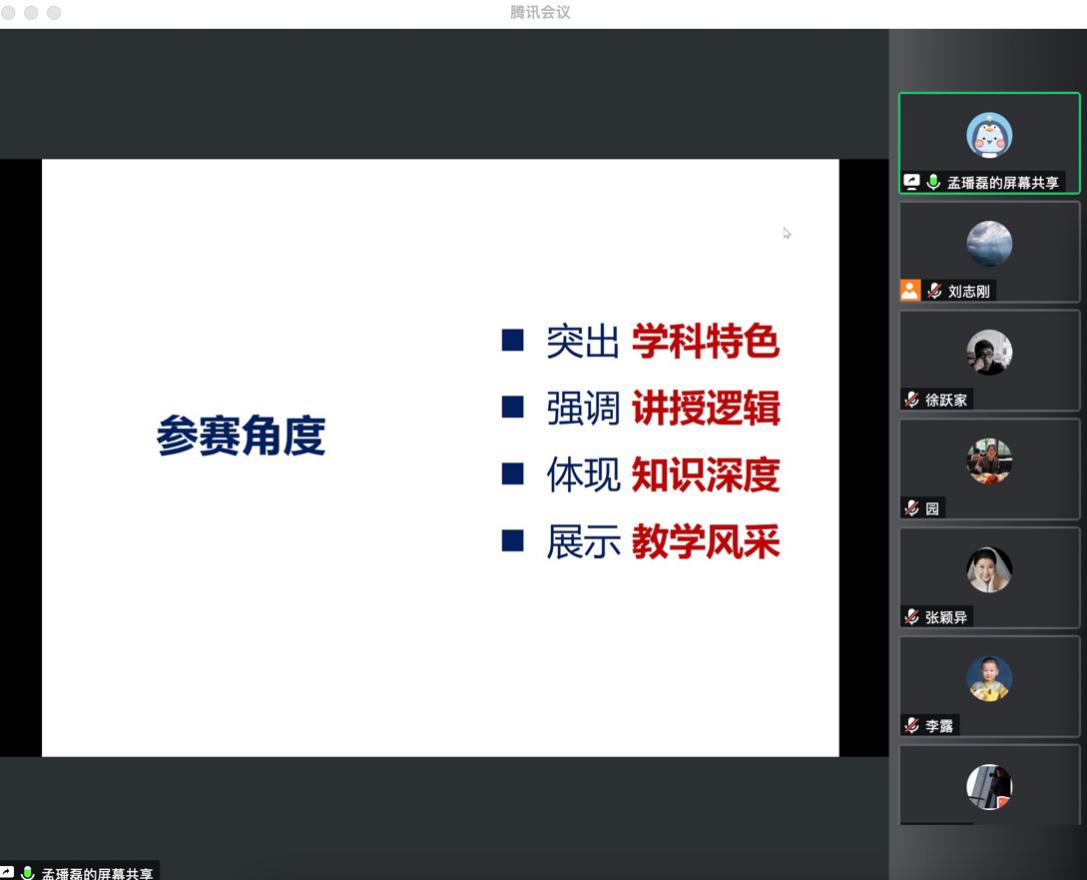 首先,孟璠磊老师从教学方案的准备、组织材料、讲述侧重点以及现场表达等诸多方面向大家分享了他参加北京市教学比赛的心得与经验。之后,针对本周二球盟会初赛时,选手在讲课过程中反映出来的一些问题,针对性地进行了评述与讲解。最后,孟老师现场解答了老师们的问题。