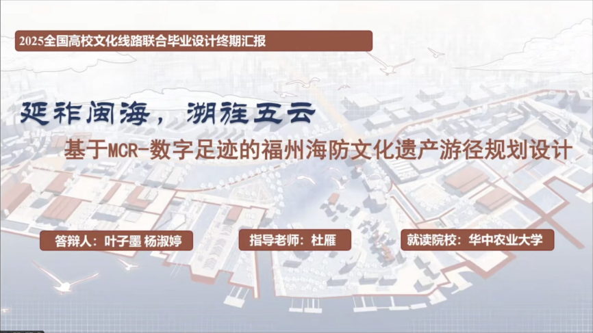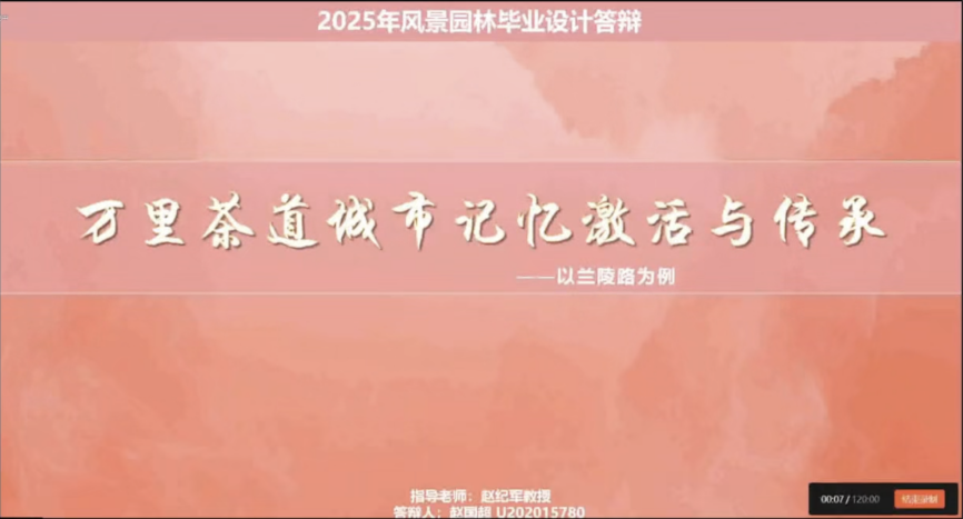 第四组汇报由华中农业大学杜雁副教授主持,参与汇报的员工来自深圳大学、东北农业大学、华中农业大学、山东农业大学,各组同学分别围绕《问潮·答岸——Nbs视角下赤潮治理驱动的红树林文化景观设计》、《万里茶道汉口段城市记忆激活与传承策略——以兰陵路为例》、《哈尔滨松花江北滨水景观廊道景观规划与设计》、《福州海防文化遗产廊道构建与规划设计》、《汶水汤汤 商贸往往——汶河古渡两岸商道景观保护与更新设计》等毕设成果进行了展示汇报。特邀专家王香春、李程成以及指导老师符兴源、赵彩君、刘钊启对各组同学的方案汇报进行了专业点评。最后,山东农业大学赵彩君教授对第三、第四组汇报进行了总结,至此,本次联合毕业设计成果汇报会圆满落幕。