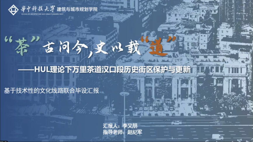 第一组汇报由华中科技大学赵纪军教授主持,汇报团队来自桂林理工大学、广东工业大学、华中科技大学,各组员工分别对《桂海铁路瓦窑-卫家渡段景观规划设计》、《广州增江沿线文化线路景观规划设计》、《文化线路视角下铁路沿线遗产要素整合设计——以粤汉铁路武昌江滩段为例》、《“茶”古问今,史以载“道”——HUL理论下万里茶道汉口段历史街区保护与更新》等毕设成果进行了汇报,特邀专家孔宪琨、李雪松以及指导教师江海燕、徐孟远对各组同学的汇报进行深入点评与专业指导。