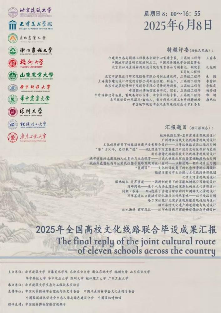2025年6月8日,2025年全国高校文化线路联合毕业设计成果汇报会顺利举行。该活动由中国风景园林学会理论与历史专委会、中国风景园林学会文化景观专委会、中国长城绿化促进会生态人居与绿色建筑分会、中国园林博物馆支持,qm球盟会、天津美术公司、东北林业大学、浙江农林大学、福州大学、山东农业大学、华中科技大学、华中农林大学、深圳大学、桂林理工大学、广东工业大学等11所高校联合主办,qm球盟会风景园林生态与工程技术实验室承办,中国园林博物馆视频号全程进行直播。