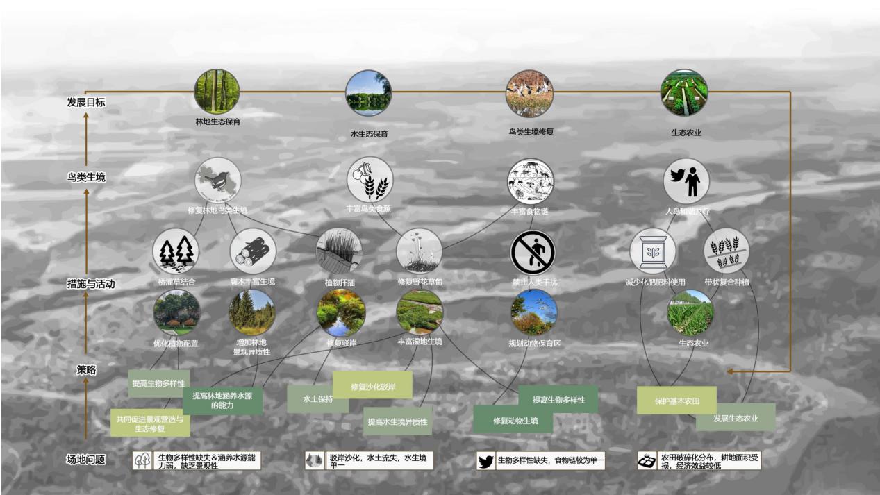 经前期分析,小组进一步明确了规划方向以及目标,并提出核心的概念。潮白河的荒凉让我们印象深刻,场地最为缺乏的是活力,不仅仅是自然的生机勃勃,还有人类与自然的共生共存。小组希望通过通过修复鸟类生境,使生境和动物协同发展,达到林地保育、水生态保育、生态农业发展、鸟类生境修复四大生态目标;希望通过自然教育的策划,串联林、水、田、村四类空间,架起人与自然之间的桥梁。于是最终提出“以鸟类生境修复促进人与自然的共生共荣,以生态自然教育带动城乡的共建共享”的发展目标,从而由此发展出“林鸟唤人归意重”的设计理念。即希望自然的生机勃勃能带领人们重回这片沃土。