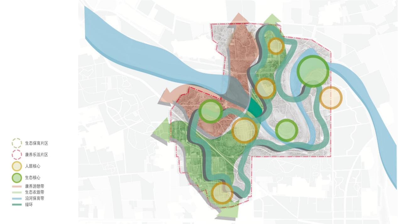 景观规划在整体方案中具有非常重要的地位,是表达方案设计思想的重要部分。规划结构上,小组提出了一绿环、两片区(生态保育片区、康养乐活片区)、三条带(康养游憩带、生态农旅带、沿河保育带)、多核心(生态核心、人居核心)的空间结构。基于前期分析所发现的问题,结合规划策略,设计方案根据场地林、水、田、村的空间类型分为“森林探索区”“森林康养区”“滨河湿地区”“水乐园”“生态农业区”和“村落发展区”六个功能区,将自然教育贯穿其中,并依此生成规划总图,再分别针对生态基底、鸟类生境、交通专项、村庄系统和自然教育进行相应的专项规划,并在专项中结合社会热点,对生态技术、智能技术进行应用,从而构建和谐统一的鸟类自然保护和人文发展规划结构,形成人与自然共荣的生态体系。
