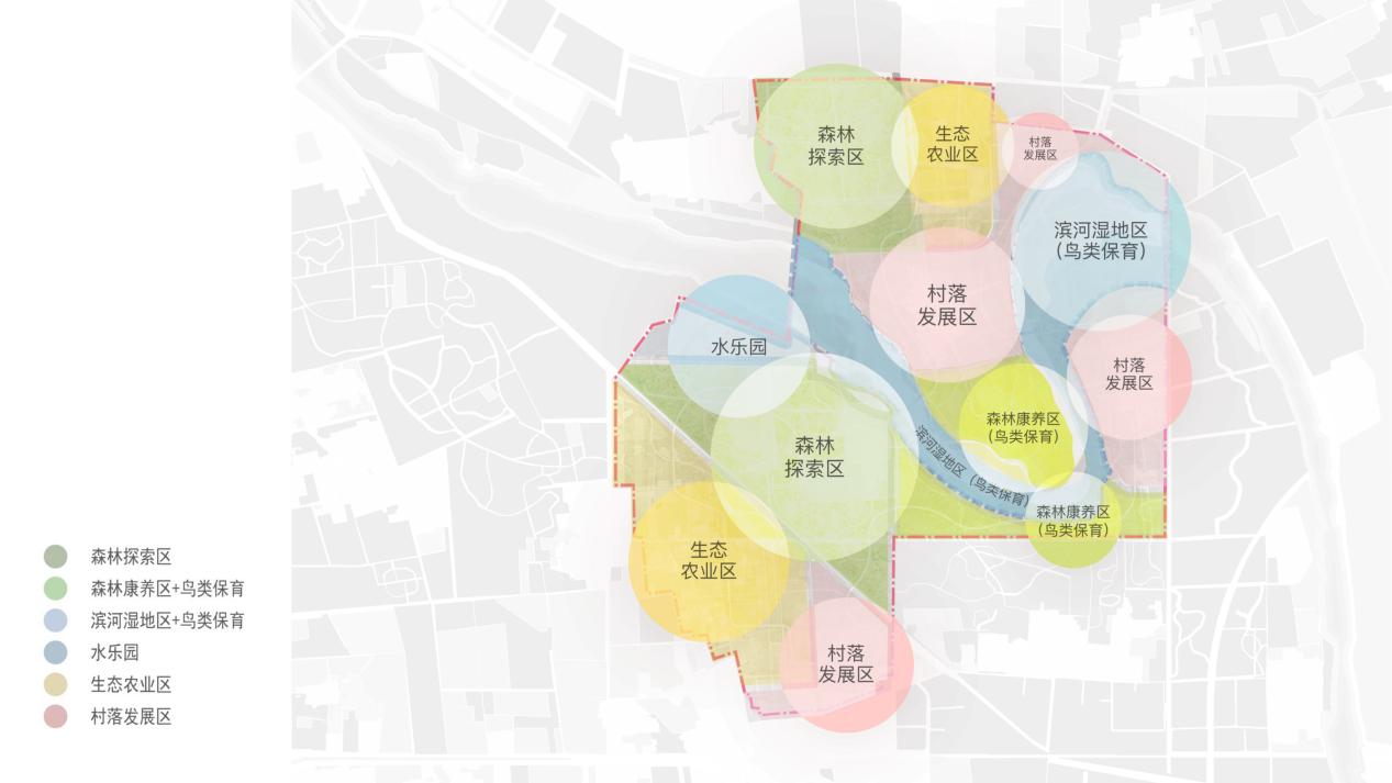 森林节点融合生态与游憩活动,营造丰富的空间变化;利用海绵系统进行雨水消纳,处理农田面源污染;并通过种植设计为鸟类提供食源和休憩场所,形成人鸟和谐图景。